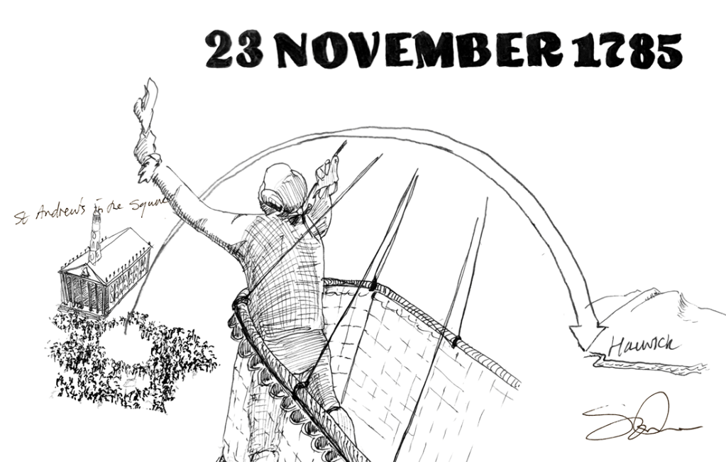 Lunardi’s balloon was hydrogen powered, not hot-aired, and he had to mix his sulphuric chemicals on site and funnel the resulting hydrogen gas into the fabric balloon which inflated while tethered to the ground by ropes which were eventually released so the balloon could lift off up into the air. On the day Lunardi took off from St Andrew’s in the Square, the breeze carried him aloft, to the amazement and satisfaction of the the many onlookers below, and his balloon was swept south east, over Hamilton and Lanark until finally ditching, later that same day, in a field near Hawick in the hills of the Scottish Borders.