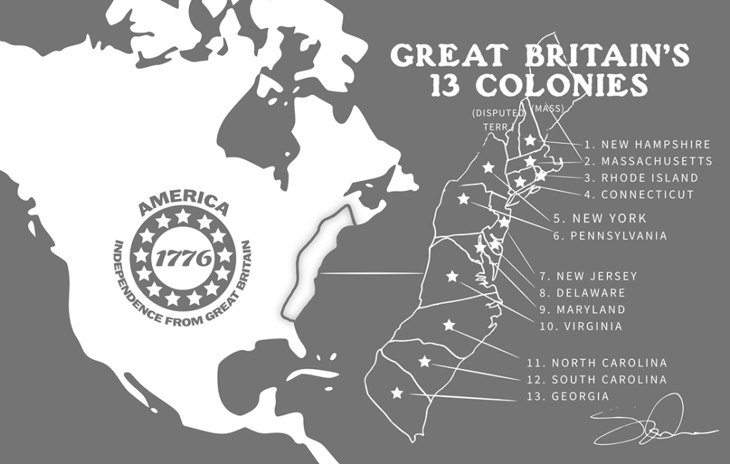 - American independence refers only to the 13 colonies. ‘America’ in this context meant the 13 British colonies which stretched down the East coast from New Hampshire in the north down to Georgia in the south. (See the illustration for this post.) These colonies began as individual settlements of dozens of people which grew into villages, towns and by 1776 some cities. There were more than two million people living in the colonies in 1776.