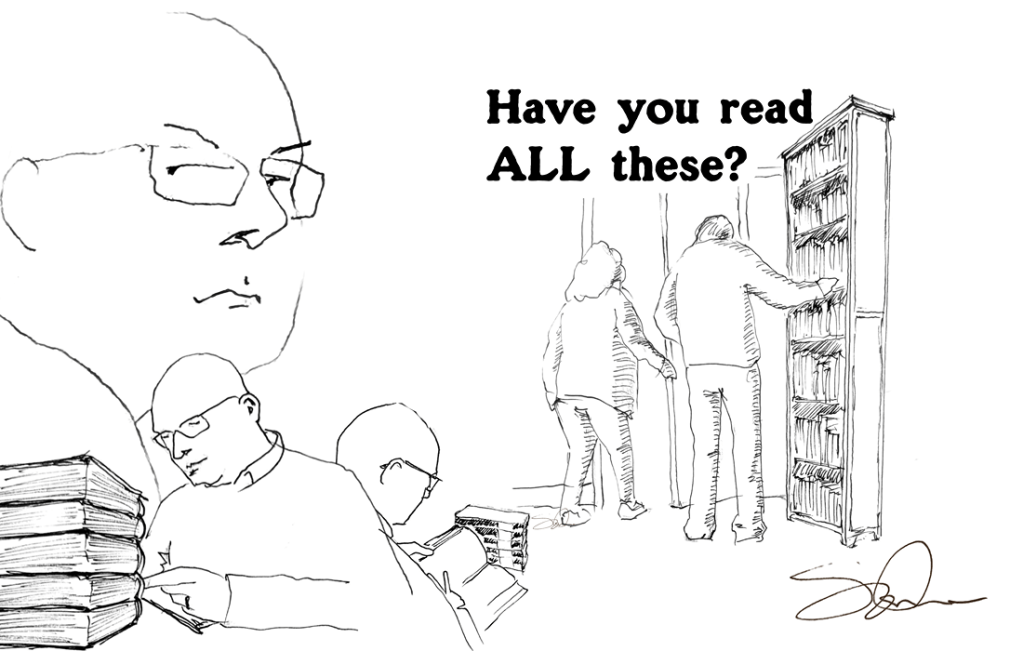 He poked one of the books in line with its neighbours and then joined his wife leaving the room. He paused and asked: “Have you read ALL these?”