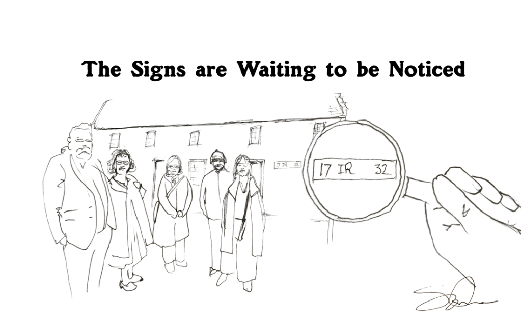 “Wait! Everyone stop there and I’ll get a photo of you,” I shout. Only five out of the eight heard me, they turned and I snapped my shot. Click. And when I looked at the picture I’ve snapped…there, behind the five figures, on the wall of the house in the background, is a sort of concrete strip which has the following engraved into it: ‘17 IR 32‘.
