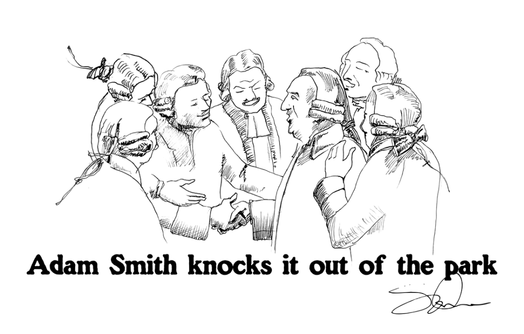 It may be a tough read, but the ideas in it have been expertly simplified and described by Smith. He was used to communicating difficult concepts and ideas to students attending his classes in ethics and law, early on in his career at the University of Glasgow. According to David Daiches Raphael, who wrote the Introduction to my Everyman’s Library edition, “Most of the youngsters who attended Smith’s classes in their second year of university study were twelve to fourteen years old… The Wealth of Nations is far more sophisticated than the lectures from which it grew, but Smith retained the aim and the knack of making himself understood by the non-specialist.”