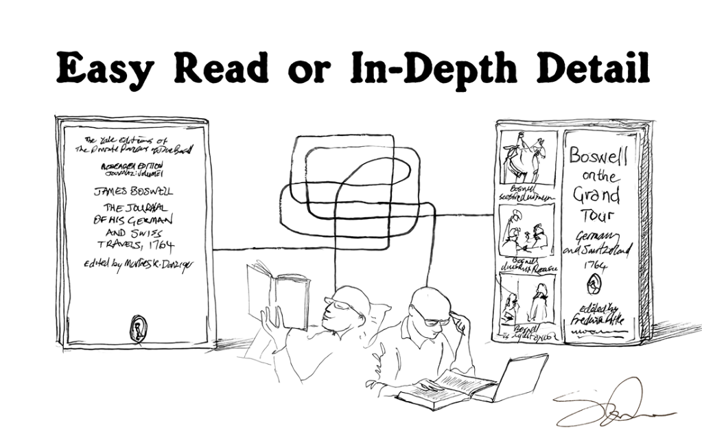 The reason for this post is that I just recently bought a copy of the Research edition of the first part of Boswell’s Grand Tour of Europe. I thought it would be interesting to compare my recently-bought Research edition with my Trade (or reading) edition, bought and read back in summer 2021.